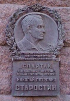 После смерти Н.П.Старостина в Москве на доме 19А по Тверской улице была открыта мемориальная доска. В 2008 году в городе Ульяновск также была открыта мемориальная доска.