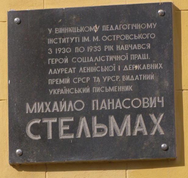 Установлена в городе Винница (Украина) на здании учебного корпуса №1 Винницкого педагогического университета (улица Острожского, 34), в котором в 1930-1933 годах учился М.А.Стельмах. Фото Олега Кожухаря, 31.03.2010.