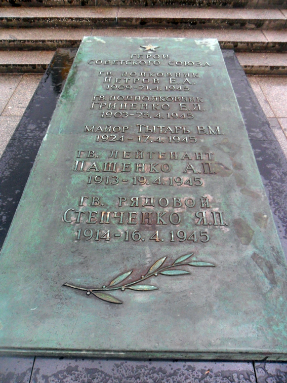 Когда у наших бойцов кончились боеприпасы, они вступил в рукопашный бой с противником. В этом бою гвардии красноармеец Я.П. Степченко прикладом автомата уничтожил одного гитлеровского солдата, но и сам погиб. Похоронен в Берлине в Тиргартен-парке.