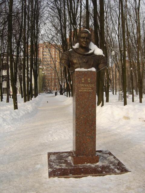 Бронзовый бюст дважды Героя Советского Союза Г.М. Стрекалова установлен в городе Мытищи в сквере, носящем его имя.