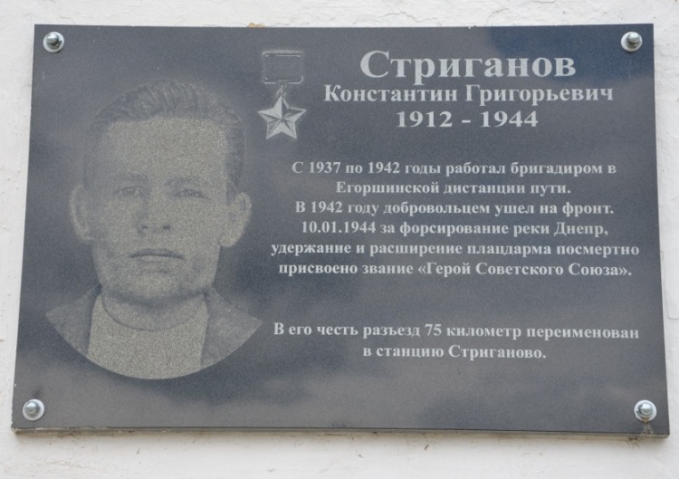 Именем Стриганова названа станция на Егоршинском отделении железной дороги, на здании которой ему установлена мемориальная доска. Ещё одна доска Герою установлена на здании центральной районной библиотеки в городе Реж Свердловской области.