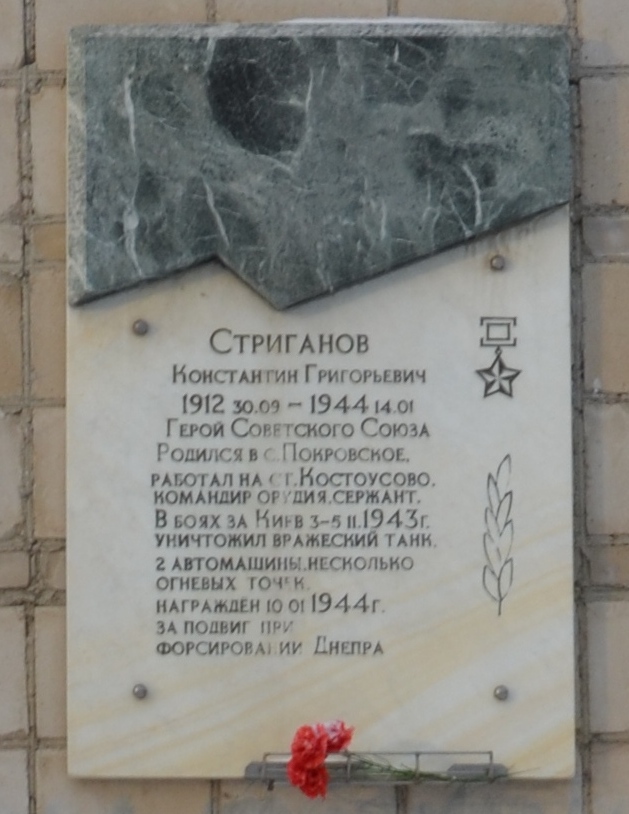 Указом Президиума Верховного Совета СССР от 10 января 1944 года за образцовое выполнение боевых заданий командования на фронте борьбы с немецкими захватчиками и проявленные при этом отвагу и геройство сержанту Стриганову Константину Григорьевичу присвоено звание Героя Советского Союза с вручением ордена Ленина и медали "Золотая Звезда".