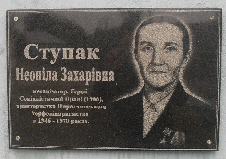 Указом Президиума Верховного Совета СССР от 29 июня 1966 года за выдающиеся успехи в выполнении заданий семилетки по развитию торфяной промышленности трактористке Пиротчинского торфопредприятия Ступак Неониле Захаровне присвоено звание Героя Социалистического Труда с вручением ордена Ленина и золотой медали «Серп и Молот».