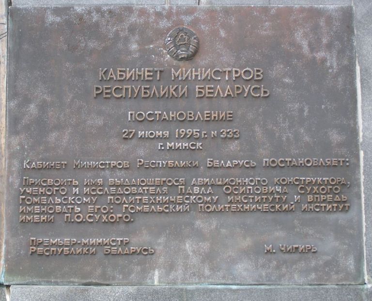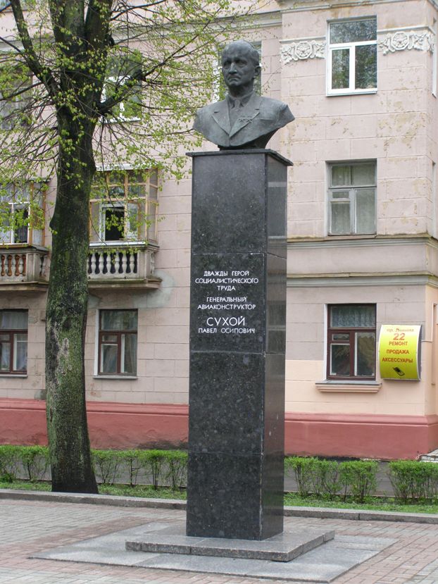 В городе Гомель установлены бюст Героя и мемориальная доска на здании бывшей гимназии, в которой он учился, в Москве – мемориальные доски на доме, в котором он жил, и на здании МГТУ. Его именем названы Гомельский государственный технический университет, улицы в Москве (2004) и Гомеле. В 1985 году в школе №1 города Глубокое был открыт музей П.О.Сухого.