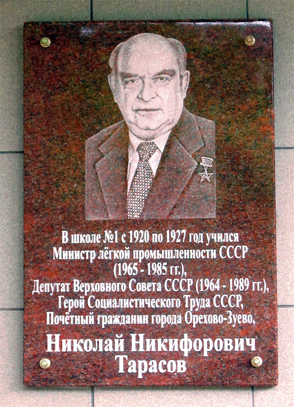 Мемориальная доска Тарасову Н.Н. на школе № 1 в городе Орехово-Зуево, которой он учился. Фото предоставил Федор Гопиенко.