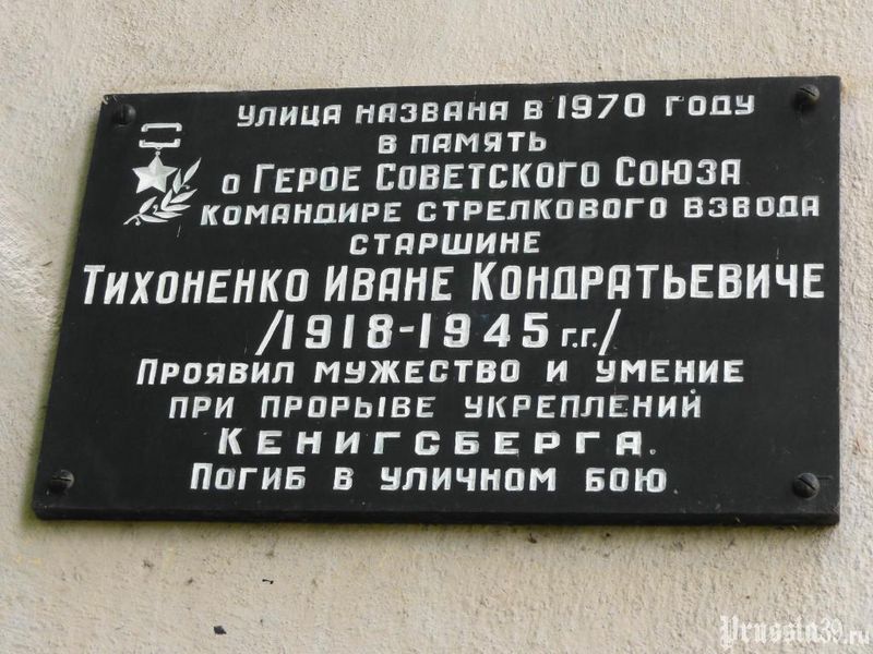 Тихоненко Иван Кондратьевич – командир стрелкового взвода 349-го Казанского Краснознаменного стрелкового полка (26-я Сталинская Краснознаменная ордена Суворова стрелковая дивизия, 90-й стрелковый корпус, 43-я армия, 3-й Белорусский фронт), старшина.