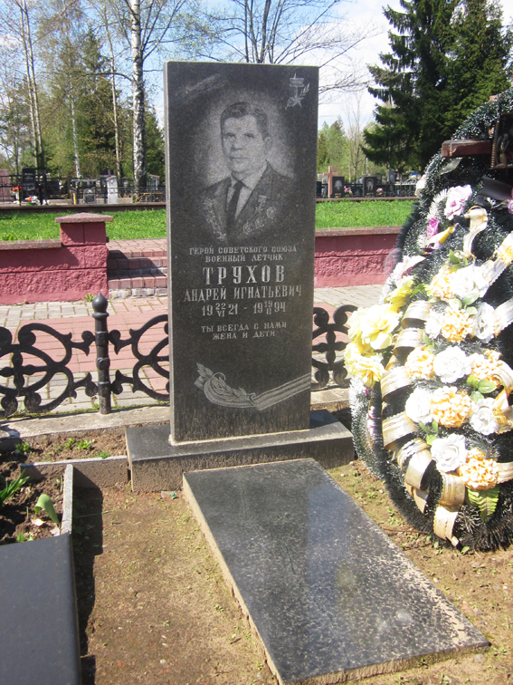 ...Над целью, откуда ни возьмись, появились два немецких истребителя «Фокке-Вульф-190». Они зашли сзади со стороны солнца, поэтому воздушные стрелки заметили их слишком поздно. Трухов в группе шел крайним левым, и оба вражеские истребители атаковали замыкающего. Удар был настолько сильный, что Андрею показалось, как будто он с кем-то столкнулся. Тут же самолет потянуло в крутое пикирование. Только опыт летчика помог ему дотянуть до своего аэродрома — Днепровская. После посадки он попытался вылезти из кабины, но не смог: осколком снаряда заклинило фонарь. Только с помощью механика самолета фонарь, наконец-то, открыли.