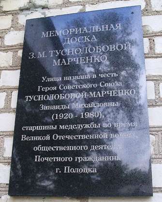 Почётный гражданин города Полоцка, где улица носит её имя и открыт музей-квартира Героини. Стенд, посвящённый исключительному мужеству З.М. Туснолобовой-Марченко, размещён в музее-квартире Н.А. Островского "Преодоление" в доме № 14 по улице Тверской в городе-герое Москве.