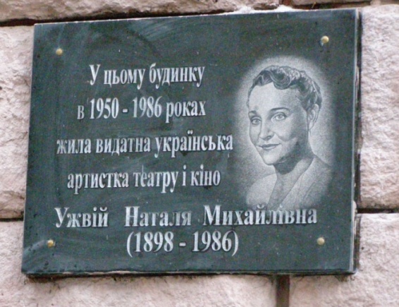 Установлена в Киеве (Украина) на доме (улица Городецкого, 17/1), в котором в 1950-1986 годах жила Н.М.Ужвий. Фото Олега Кожухаря, 8.01.2010.