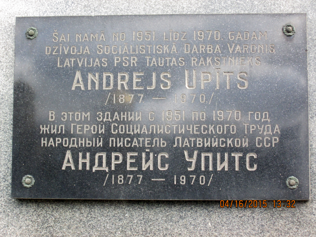 Установлена в городе Рига (улица Бривибас, дом 38) на доме, в котором в 1951-1970 годах жил А.М.Упит. Фото А.Ф.Цветкова, 16.04.2015.