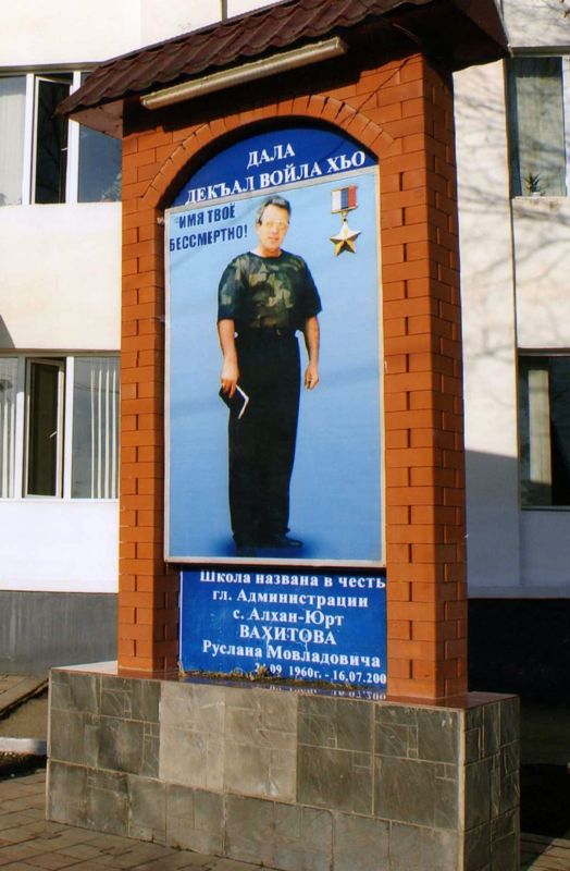 Памятный знак установлен около средней школы № 1 имени Р.М.Вахитова в селе Алхан-Юрт Урус-Мартановского района Чеченской Республики.