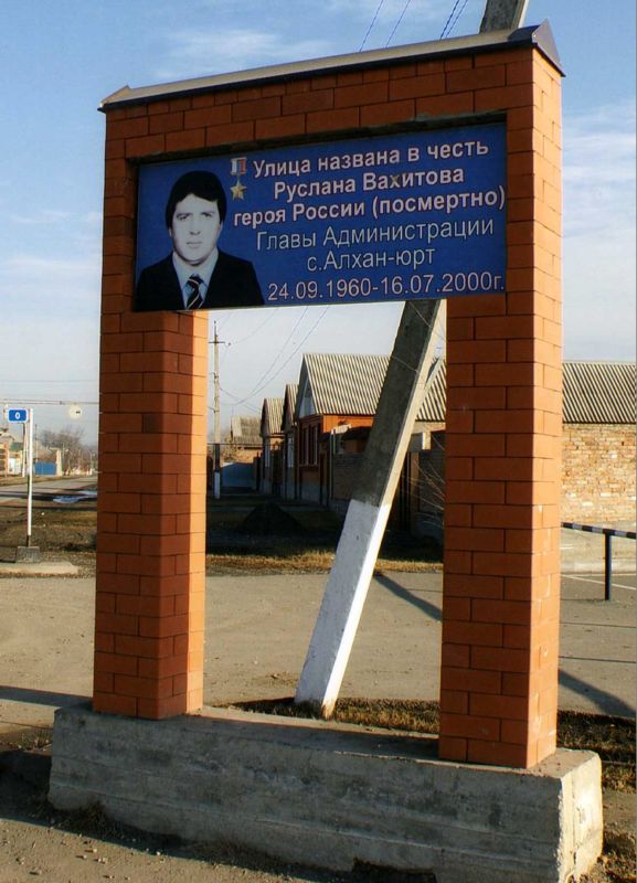 Памятный знак установлен в начале улицы имени Р.М.Вахитова в селе Алхан-Юрт Урус-Мартановского района Чеченской Республики.