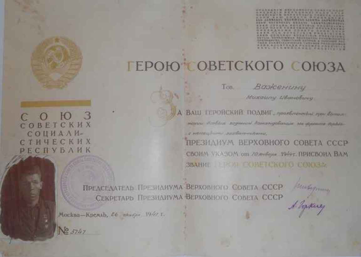 Указом Президиума Верховного Совета СССР от 10 января 1944 года пулеметчику, гвардии рядовому Михаилу Ивановичу Важенину было присвоено звание Героя Советского Союза с вручением ордена Ленина и медали "Золотая Звезда"(№ 6675)