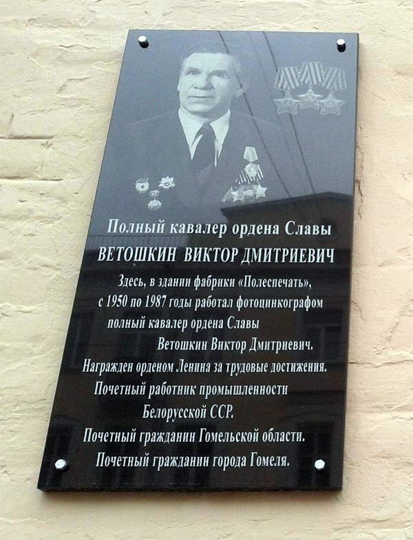 На здании ОАО «Полеспечать» (улица Советская, дом 1) в Гомеле установлена мемориальная доска В. Д. Ветошкину (торжественно открыта 26 ноября 2014 года).