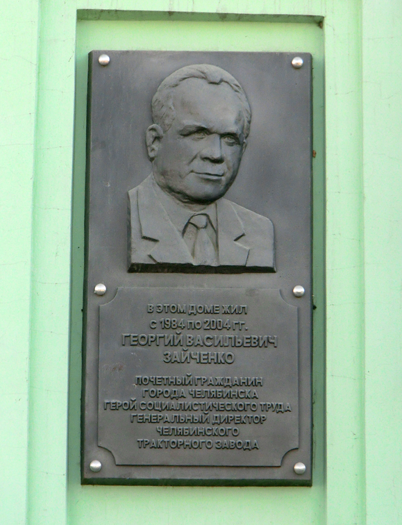 Установлена в городе Челябинск (проспект Ленина, дом 17) на доме, в котором в 1984-2004 годах жил Г.В.Зайченко. Фото Владимира Светлова, 11.02.2012.