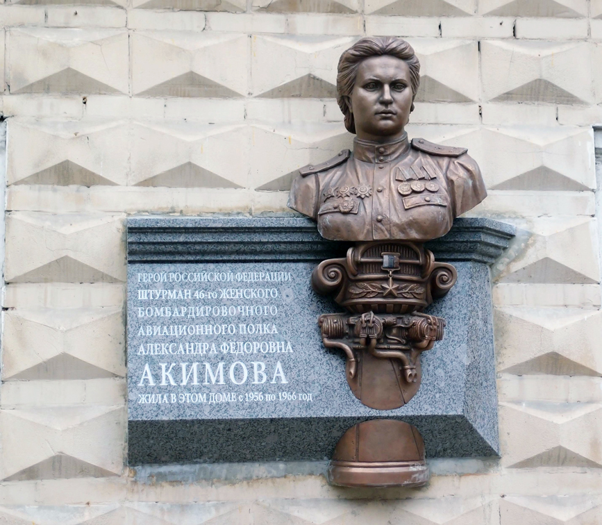 Акимова Александра Фёдоровна - штурман авиаэскадрильи 46-го гвардейского ночного бомбардировочного авиационного Таманского Краснознамённого ордена Суворова 2-й степени полка (325-я ночная бомбардировочная авиационная Осовецкая Краснознамённая ордена Суворова 2-й степени дивизия, 4-я воздушная армия, 2-й Белорусский фронт), старший лейтенант - к моменту представления к званию Героя Советского Союза.
