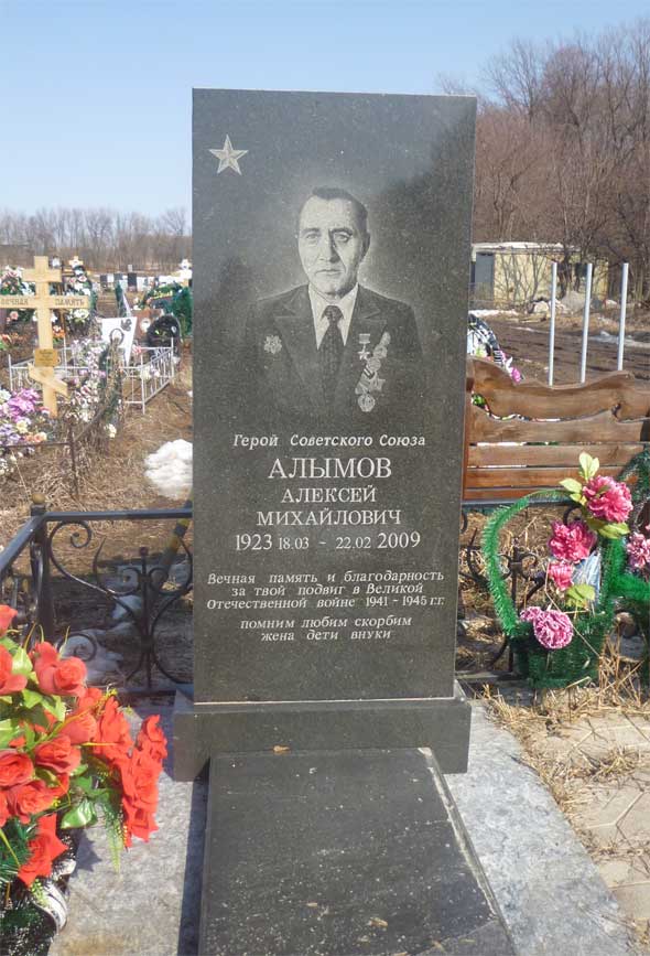 Пробравшись к своей группе, младший сержант А.М. Алымов принял над ней командование вместо погибшего командира и вывел бойцов в расположение полка. В этом бою А.М. Алымов лично уничтожил 54 немца.