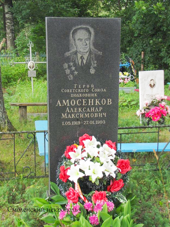 В городе Велиж Смоленской области на Аллее Героев установлен барельеф А.М.Амосенкова. Его имя носит школа в деревне Крутое.