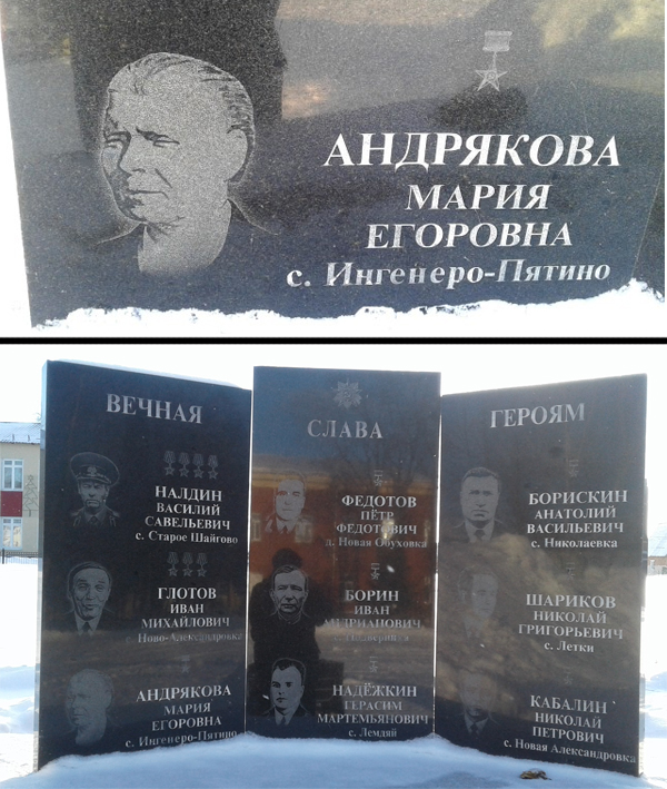 Ее имя увековечено на мемориале Героям в селе Старое Шайгово.