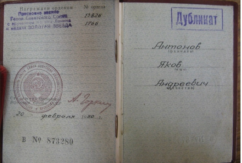 Тов. Антонов Я.А. в боях за переправу через реку Десна и создание плацдарма на ее западном берегу проявил себя как герой и патриот Родины, не знающий ни страха, ни трудностей на пути к выполнению поставленной задачи. Переправившись через реку Десна под огнем противника и получив задачу – разведать впереди лежащую местность, он натолкнулся на вражескую огневую точку. Под сильным пулеметным огнем, рискуя жизнью, он подполз к вражеской огневой точке и забросал ее гранатами. Убив двух немцев и ранив одного, захватил пулемет. В боях за создание плацдармов для переправ при форсировании рек Днепр и Припять при контратаках немцев расстреливал в упор вражеских солдат. Хорошо маскируясь, он всегда стремится близко подпустить противника, а затем мощной очередью пулемета уничтожить его. В боях за село Колыбань под ураганным вражеским обстрелом он уничтожил огнем своего пулемета до 50 солдат и офицеров. Храбрость в сочетании с умением драться создали славу этому герою не только в подразделении, но и во всей части. За проявленное мужество достоин звания Героя Советского Союза. Командир 109 стрелкового полка майор Сухарников