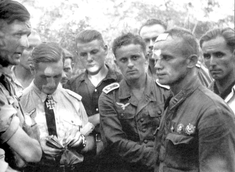 Работая над этой книгой и просматривая одну из публикаций М. Антилевского, случайно обратил внимание на фотографию, на которой был изображён наш плененный Герой, беседовавший с немецкими лётчиками.