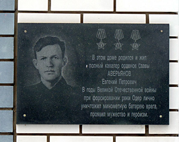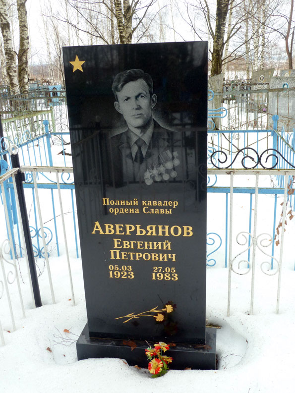 Аверьянов Евгений Петрович - командир минометного расчета 232-го минометного полка (12-я артиллерийская дивизия прорыва, 69-я армия, 1-й Белорусский фронт) сержант - на момент представления к награждению орденом Славы 1-й степени.