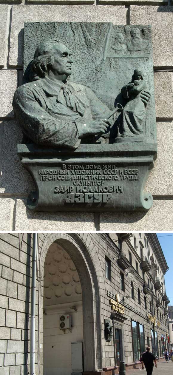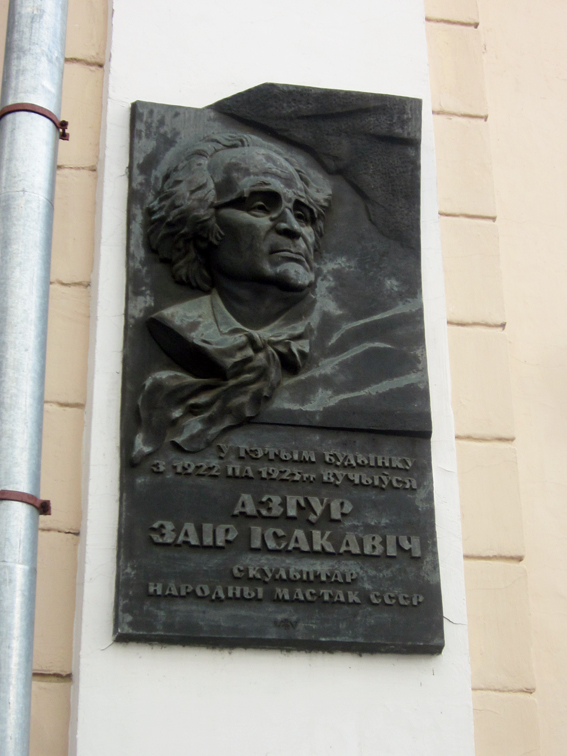 Установлена в Минске (проспект Независимости, дом 13) на доме, в котором жил З.И.Азгур. Фото Александра Захарова, 5 июля 2014 года.