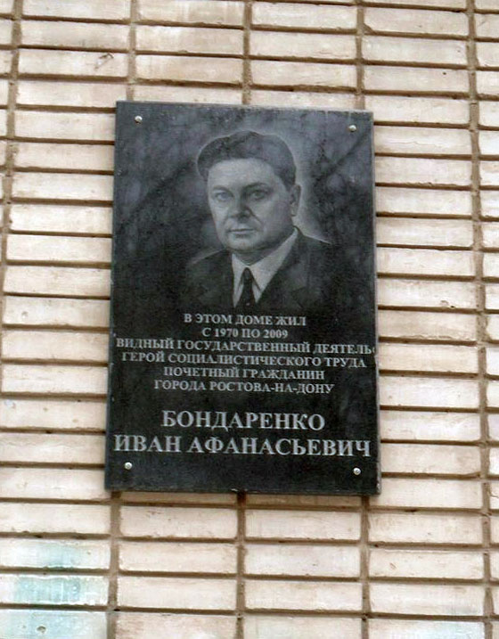 Указом Президиума Верховного Совета СССР от 7 декабря 1973 года за большие успехи достигнутые во Всесоюзном социалистическом соревновании, большой личный вклад в выполнении принятых обязательств по увеличению производства и продажи государству продуктов растениеводства и животноводства первому секретарю Ростовского обкома КПСС Бондаренко Ивану Афанасьевичу присвоено звание Героя Социалистического Труда с вручением ордена Ленина и золотой медали «Серп и Молот».