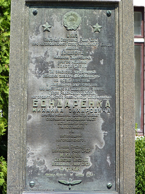 Указом Президиума Верховного Совета СССР от 24 августа 1943 года майор Бондаренко Михаил Захарович награждён второй медалью «Золотая Звезда».