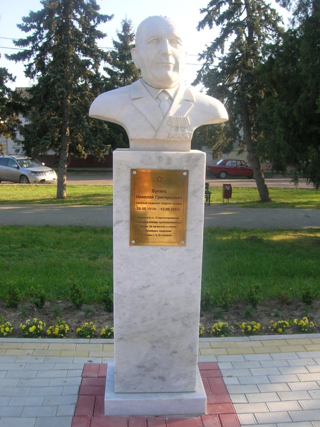 Бугаец Николай Григорьевич - помощник командира взвода 1161-го стрелкового полка (351-я стрелковая дивизия, 18-я армия, 1-й Украинский фронт), старший сержант – на момент представления к награждению орденом Славы 1-й степени.