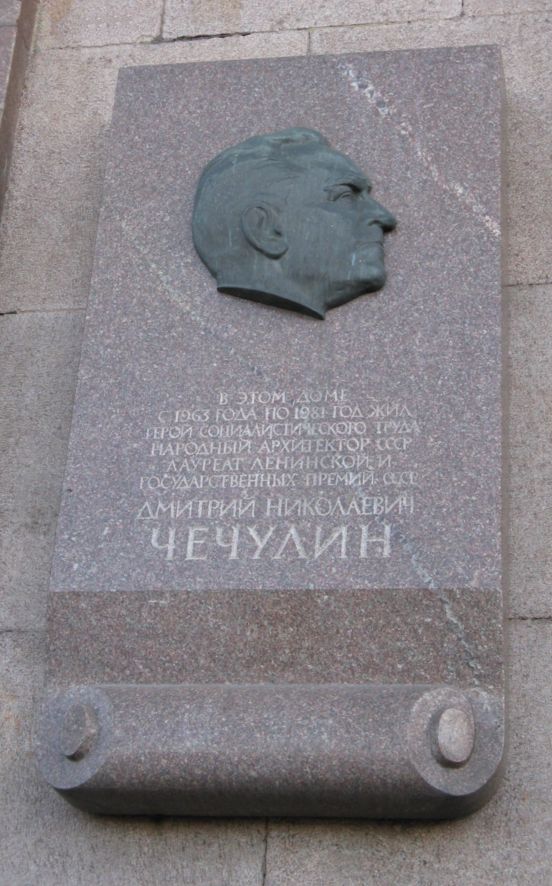 Мемориальная доска в Москве на доме, где в 1963-1981 годах жил Д.Н.Чечулин (Котельническая набережная, 1/15). Фото В.Б.Лушпая (Москва), 2010.