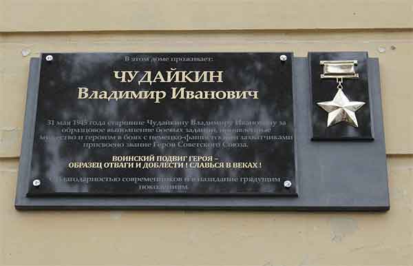 Командир орудия танка Т-34 269-го танкового батальона 23-й танковой бригады (9-й танковый корпус, 3-я ударная армия, 1-й Белорусский фронт) старшина В.И.Чудайкин отличился 1 мая 1945 года в ходе боёв за рейхстаг в столице гитлеровской Германии - Берлине.