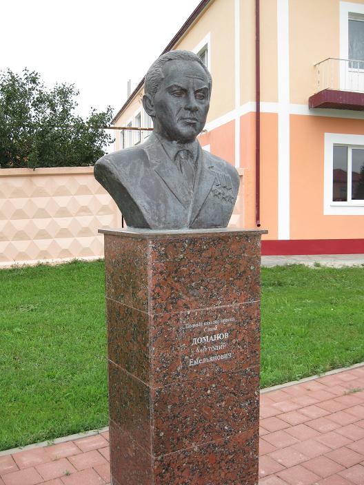В посёлке городского типа Прохоровка на Аллее Героев установлен бюст А.Е.Доманова.