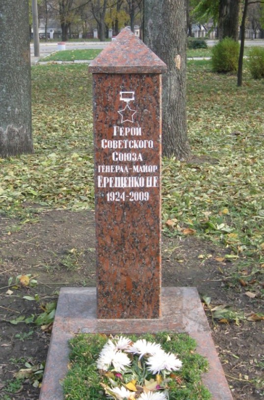 Именем Героя названа средняя школа в его родном селе. В городе Кировоград на доме (улица Гагарина, 27), в котором жил Н.Е.Ерещенко, в октябре 2009 года открыта мемориальная доска.