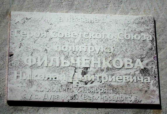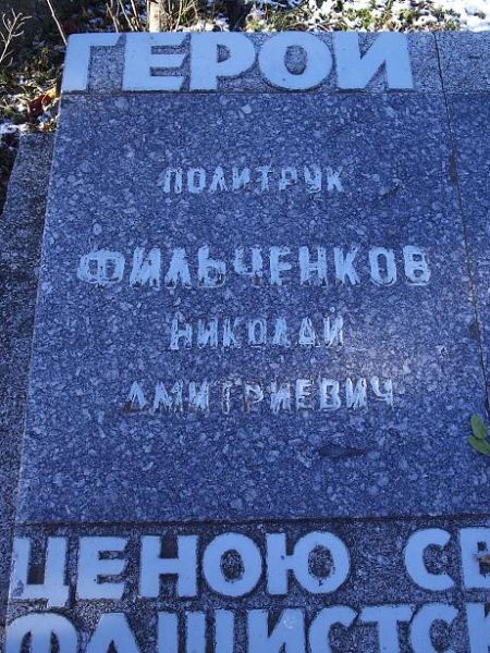 Начальник клуба 18-го отдельного батальона морской пехоты (Береговая оборона, Черноморский флот) политрук Николай Фильченков во главе группы из пяти моряков 7 ноября 1941 года в районе села Дуванкой (ныне село Верхнесадовое администрации города-героя Севастополя) отражал атаки противника, пытавшегося пробиться к городу Севастополю. Группа вступила в единоборство с двадцатью двумя фашистскими танками и десять из них уничтожила, враг был остановлен. В критический момент боя политрук Фильченков с последними гранатами бросился под вражеский танк.