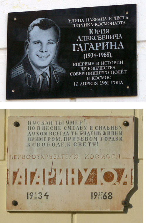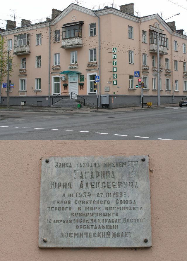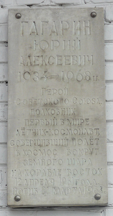 В целях увековечения памяти Ю.А. Гагарина в 1968 году город Гжатск Смоленской области был переименован в город Гагарин. Имя Гагарина присвоено Военно-воздушной академии в 1968 году. Учреждена стипендия имени Ю.А. Гагарина для курсантов военных авиационных училищ. Учреждена медаль имени Ю.А. Гагарина (FAI). Имя Гагарина носят Центр подготовки космонавтов, научно-исследовательское судно, астероид № 1772 (6.02.1968), кратер на обратной стороне Луны, авиационное производственное объединение (город Комсомольск-на-Амуре), учебные заведения, улицы и площади многих городов мира. В Москве, Чебоксарах, Гагарине, Звёздном городке, Люберцах, Лондоне и других городах установлены памятники первому космонавту. У деревни Смеловки, на месте приземления первого космонавта, установлен памятный знак. В городе Гагарине открыт мемориальный дом-музей Юрия Гагарина. В честь 50-летия полета первого человека в космос, в городе Екатеринбург на фасаде дома по улице Гагарина,12 установлена мемориальная доска.