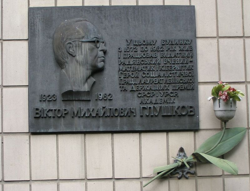 Установлена в Киеве (Украина) на доме (улица Ярославов Вал, 15а), в котором в 1972-1982 годах жил В.М.Глушков. Скульптор В.М.Клоков, архитектор Ф.И.Юрьев. Открыта в 1983 году. Фото Олега Кожухаря, 15.07.2009.