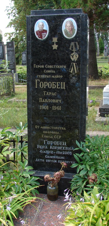 Майор Т.П. Горобец - в боях Великой Отечественной войны с июня 1941 года. Участвовал в оборонительной операции советских войск в Прибалтике, обороняя Псковский укрепрайон и прорываясь оттуда из окружения. С июля 1941 года - командир 171-го стрелкового полка в той же дивизии. С февраля 1942 года - заместитель командира 182-й стрелковой дивизии 11-й армии Северо-Западного фронта. Участник Демянской наступательной операции 1942 года. Был дважды ранен - в июне 1941 и в январе 1942 года. В мае 1942 года направлен на учёбу.