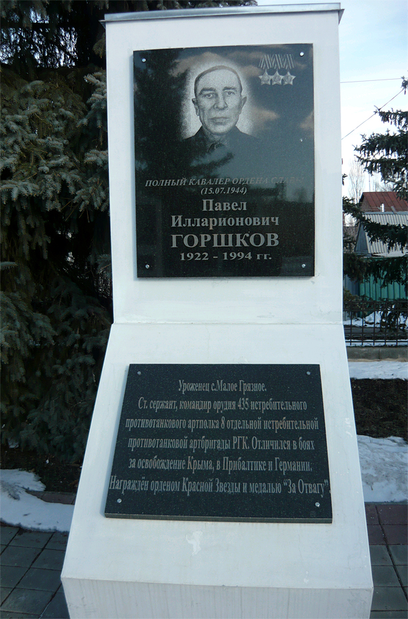Горшков Павел Илларионович – командир орудия 435-го истребительно-противотанкового артиллерийского полка (8-я отдельная истребительно-противотанковая артиллерийская бригада, 69-я армия, 1-й Белорусский фронт) старший сержант – на момент представления к награждению орденом Славы 1-й степени.