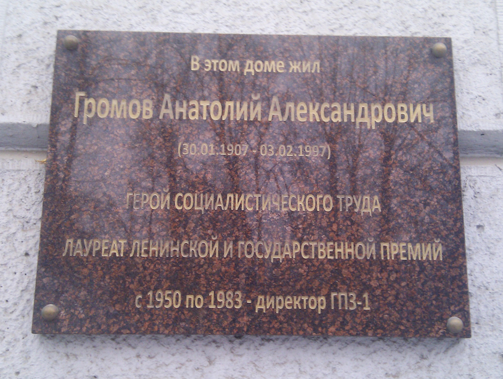 Установлена в Москве (улица Шарикоподшипниковская, дом 32) на доме, в котором жил А.А.Громов. Фото Дмитрия Шина, 15.11.2015.