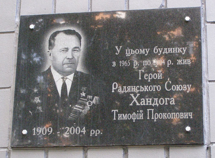 В Киеве на доме, в котором жил Герой, установлена мемориальная доска. В городе Днепропетровск именем Т.П.Хандоги названа улица.