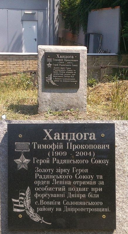 Указом Президиума Верховного Совета СССР от 19 марта 1944 года за мужество и героизм, проявленные при форсировании Днепра и удержании плацдарма, капитану Хандоге Тимофею Прокофьевичу присвоено звание Героя Советского Союза с вручением ордена Ленина и медали «Золотая Звезда» (№1943).