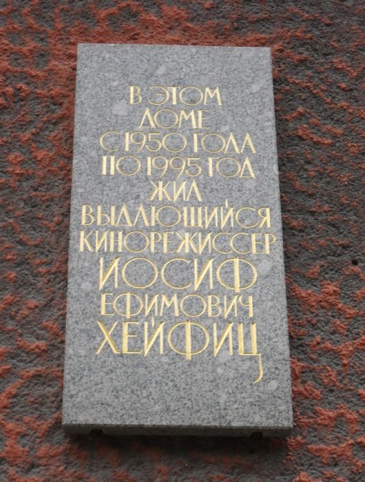 Мемориальная доска в Санкт-Петербурге на доме, где в 1950-1995 годах жил И.Е.Хейфиц (Малый проспект Петроградской стороны, 84-86). Открыта в 1998 году. Архитектор Т.Н.Милорадович. Фото А.В.Пиголицына (Санкт-Петербург), 2011.