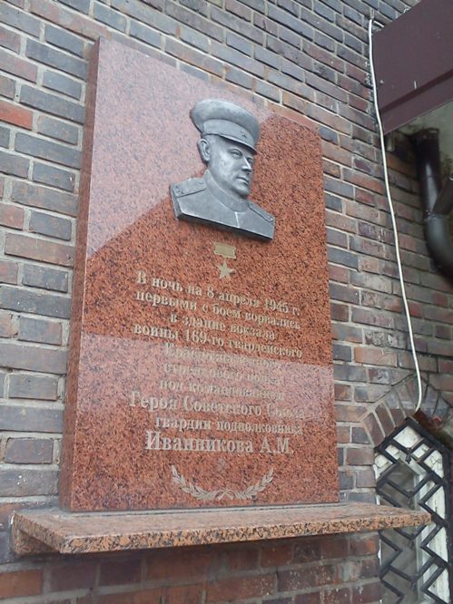 «В ночь на 8 апреля 1945 года первыми с боем ворвались в здание вокзала воины 169-го гвардейского Краснознаменного стрелкового полка под командованием гвардии подполковника Иванникова А.М.»