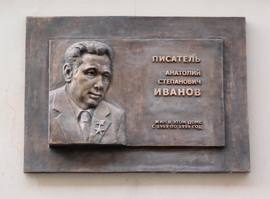 Установлен в Москве (2-й Обыденский переулок, дом 12) на доме, в котором в 1969-1999 годах жил А.С.Иванов. Открыта 17 мая 2012 года. Скульптор Н.Селиванов. Фото Станислава Лебедева, 15.06.2012.