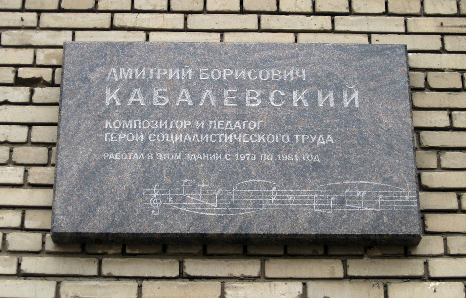 Установлена в Москве (улица Нижняя Масловка, дом 16) на здании бывшей школы № 209 (ныне центр образования № 1601), в которой в 1973-1981 годах работал учителем музыки Д.Б.Кабалевский. Открыта в 2005 году. Фото Станислава Лебедева, 6.04.2011.