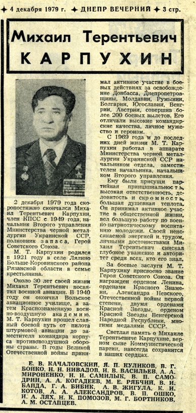 В Киеве, у подножия монумента Родина-мать, перечислены фамилии Героев Советского Союза, которые освобождали Украину. Среди них есть и фамилия Карпухина М.Т.