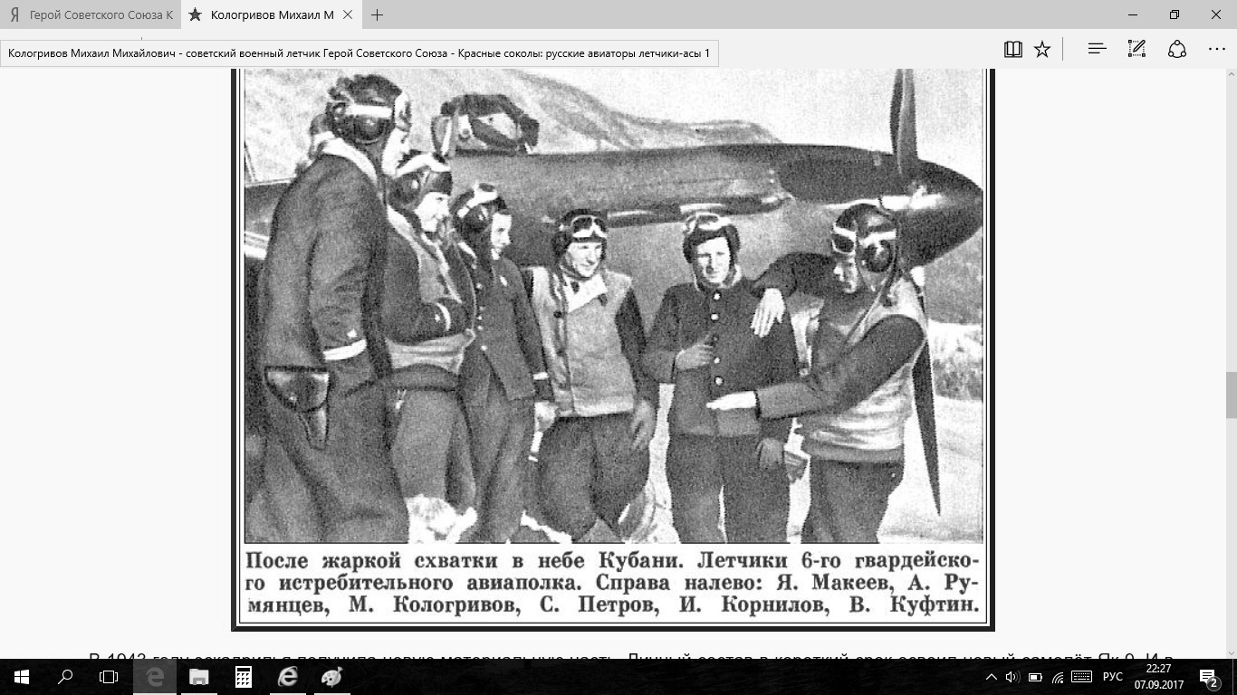 "Авиаторы! Бейте врага так, как его сокрушают летчики звеньев Георгия Москаленко и Михаила Кологривова. Сегодня от их метких очередей рухнули на землю четыре Ю-87!"