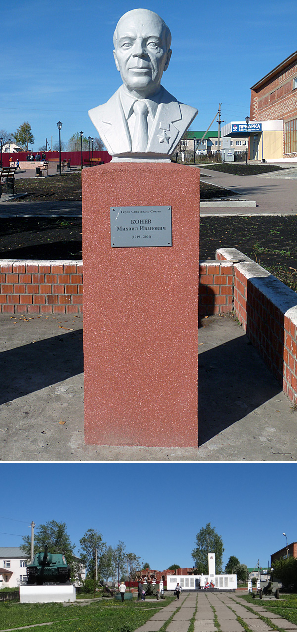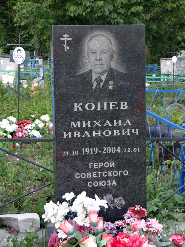 В поселке Октябрьский на площади Победы установлен бюст Героя, на здании Дома детского творчества, бывшего районного комитета КПСС установлена мемориальная доска. В деревне Порозово Октябрьского района, где родился М. И. Конёв, на памятнике землякам увековечено имя Героя.