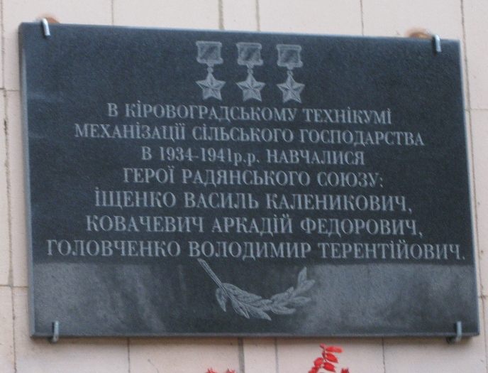 В городе Кировоград на здании техникума механизации сельского хозяйства, в котором учился Герой, установлена мемориальная доска.